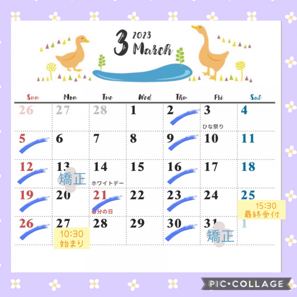 3月の矯正日 3月の矯正は3/13(月)と3/31(金)です。 休診日は診療カレンダーをご覧ください。 2023.02.27 ùお知らせ一覧へ戻る Archive 2025 2024 2023 2022 2021 2020 2019 2018 2017 2016